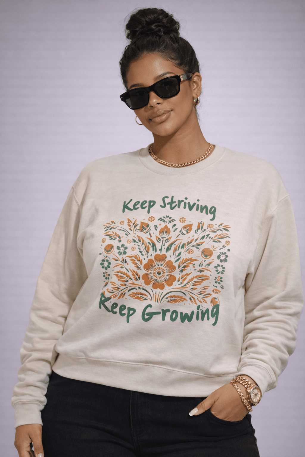 The Keep Striving • Keep Growing Heavy Crewneck is made for the focused ones. Featuring an uplifting floral graphic with soft earthy tones, this piece is a reminder to stay grounded, keep pushing, and keep evolving — even when nobody’s watching.